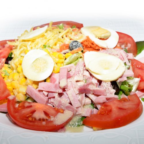 mezclum, tomate, jamón, queso, zanahoria, maíz y huevo duro